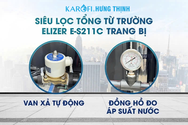 Một điều khiến cho máy siêu lọc tổng từ trường E-S211C đặc biệt hơn các dòng máy lọc tổng khác đó là có trang bị van xả tự động. Điều này giúp ích cho các gia đình ở chung cư có vị trí lắp đặt hạn chế. Đồng hồ đo áp suất nước giúp người sử dụng theo dõi được độ mạnh, yếu của nguồn nước đầu vào.